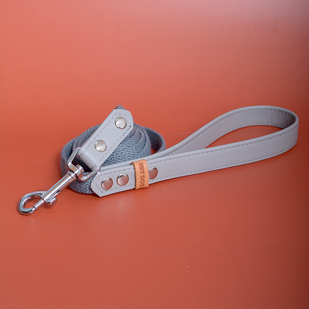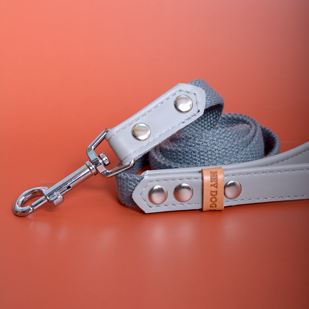 Made of soft genuine leather combined with strong, cotton tape. Our leashes are light, soft, and comfortable to use. Leather color: light grey. Tape color: grey. Hardware is made of solid brass, especially for pet accessories. The hardware is elegant and polished to a high gloss. We suggest setting up this leash with a HEY DOG Chia Pudding collar, making your dog stylish and exceptional. HEY DOG leashes are made in a few sizes (length and width), check our SIZES table. Want to buy a different length? Please write us at hey@heydog.co. We make custom orders.