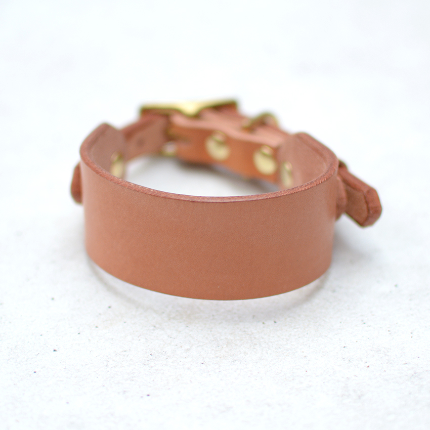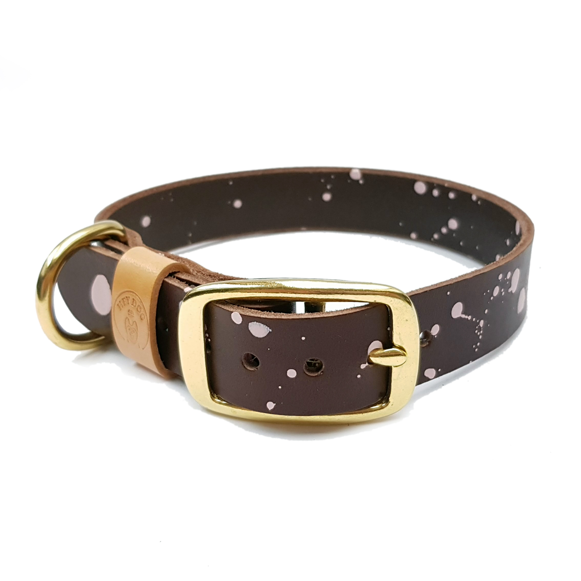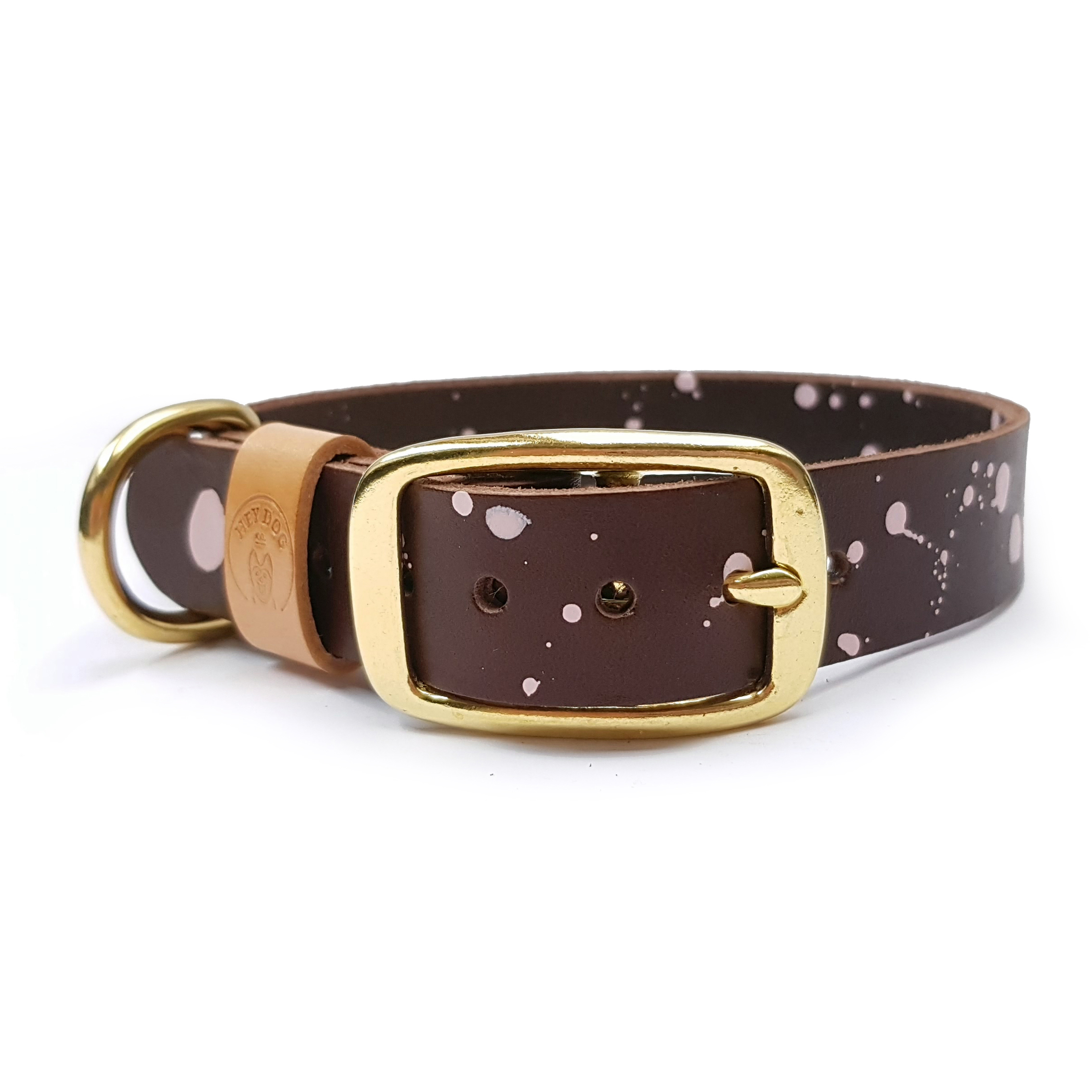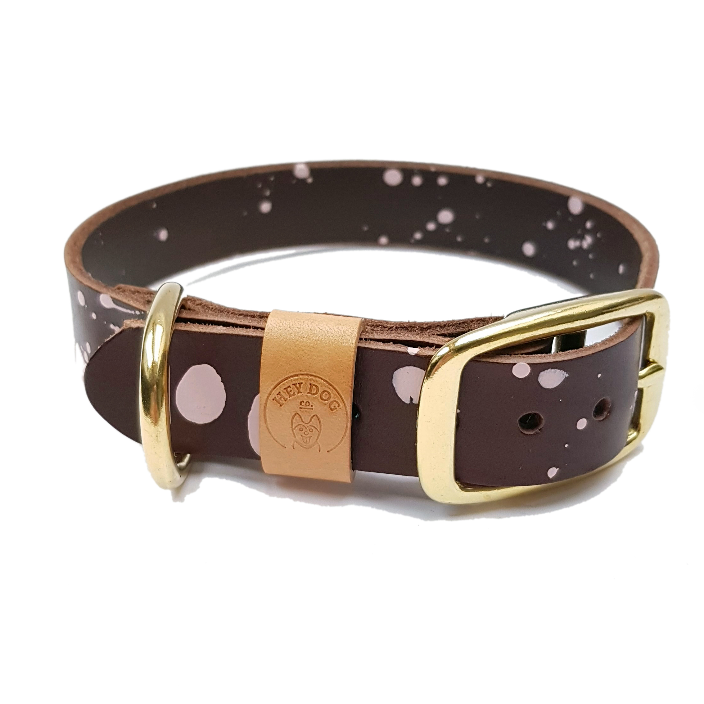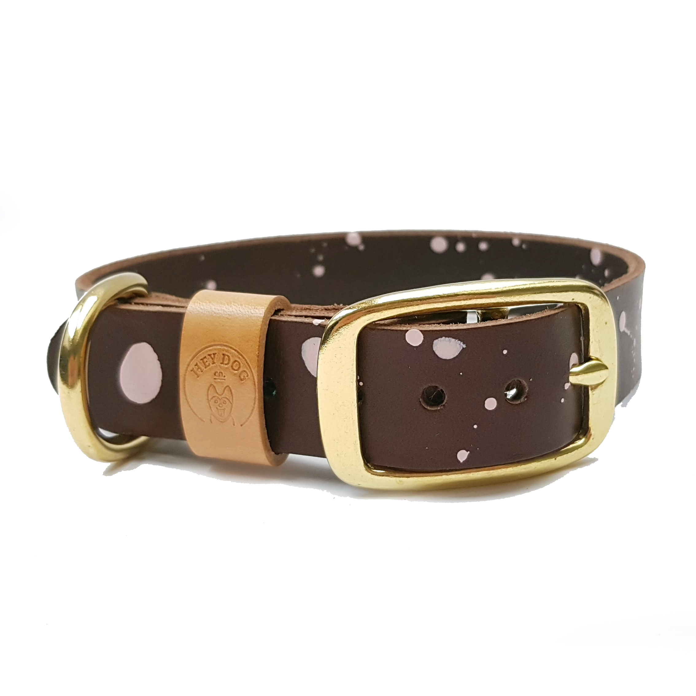 Very strong and durable collar. Perfect for large, energetic dogs. I think your dog will love it! The collar is made of Vegetable Tanned Leather. What does it mean? Veg Tan leathers are considered to be one of the best for make craft products like belts, wallets, or shoes. Products made of it are characterized by high quality and class in themselves. Minimalist form, timeless classic, traditional handicrafts. Even in the First Grades, there could be some imperfections or natural signs characteristic of this very natural item, which are not considered defects but an added value. Color: chocolate brown with extra pink dots. High quality solid brass (gold) or nickel plated steel (silver) hardware. Polished to a high gloss. Next to the size, choose the type of fittings. Our collars have many sizes. If, however, your size is not among the standard, please email us hey@heydog.co or leave a message regarding the neck size in the order note and we will create the right size for your dog 🙂