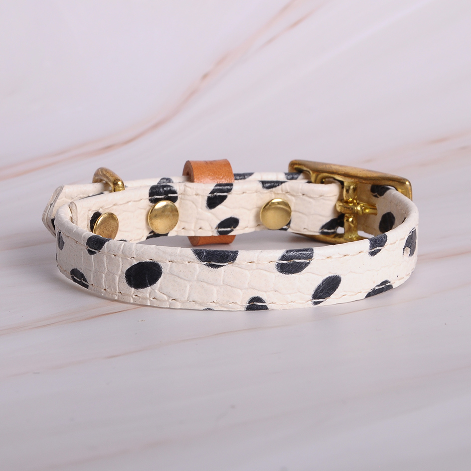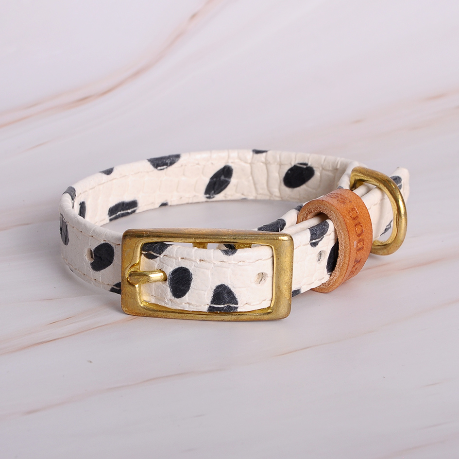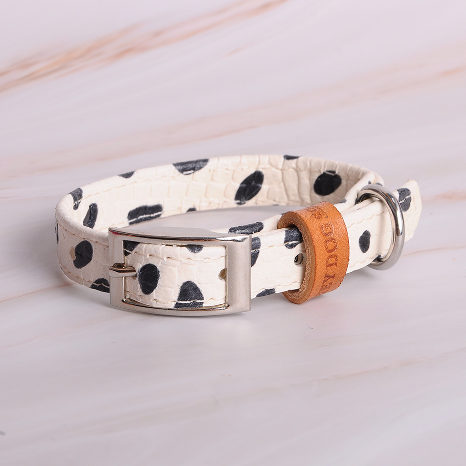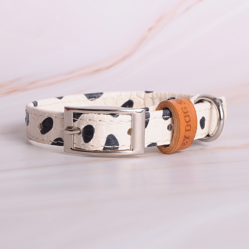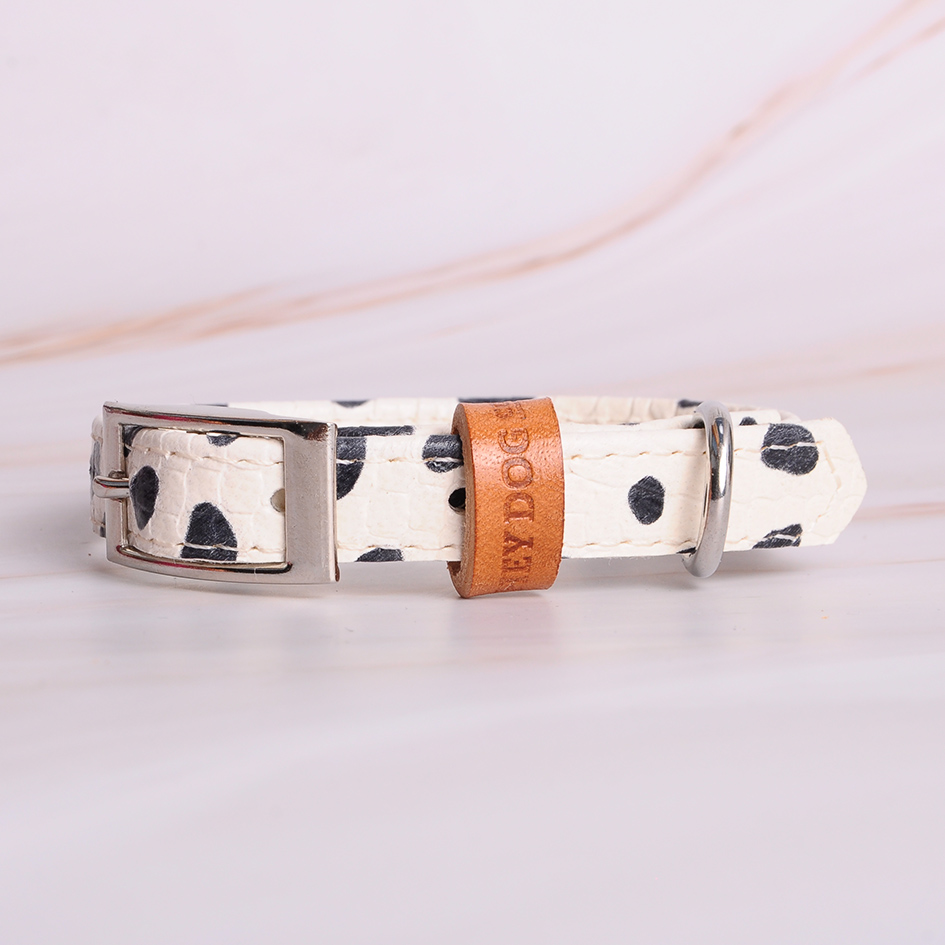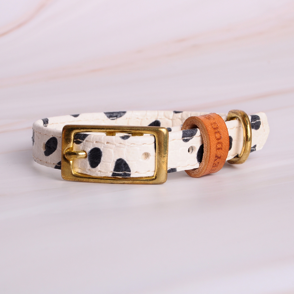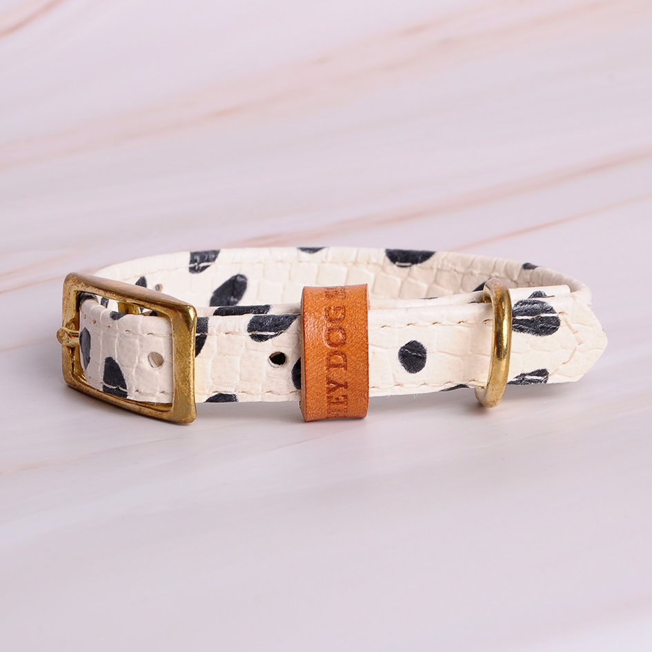 Dalmatian Dots – Elegant and stylish collar. Handcrafted collar, made of grain, cowhide leather with dalmatian print. Three layers of leather. Colors: cream and black dots. High quality solid brass (gold) or nickel-plated steel (silver) hardware. Polished to a high gloss. Next to the size, choose the color of the fittings. Check out our SIZES and choose the right one for your dog. Want to buy a different size or width? Write to us hey@heydog.co. We make collars for individual orders. With our collar, your dog will be stylish and elegant.