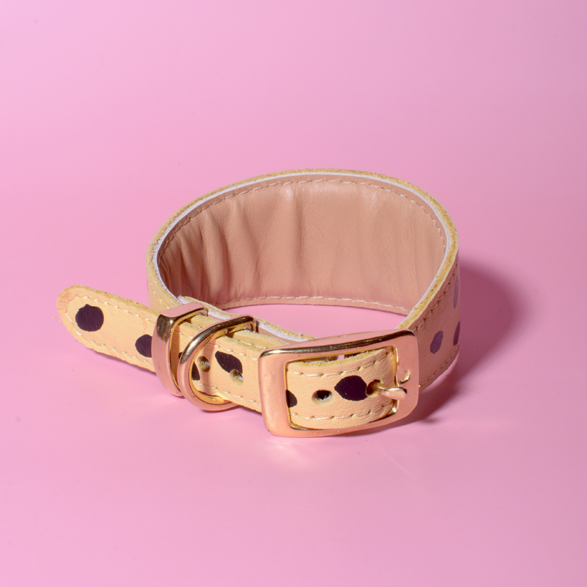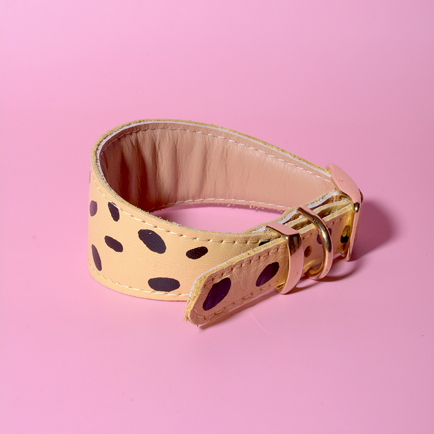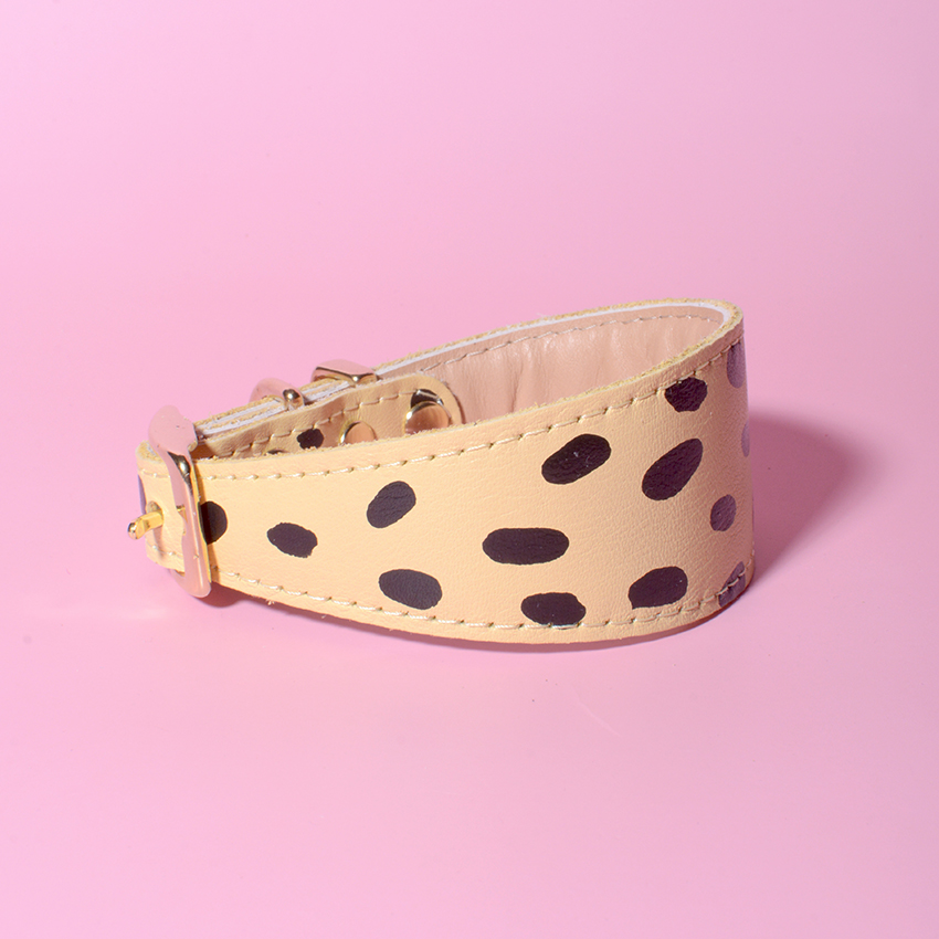 Wide collar for greyhounds and dogs that should wear such collars for comfort. The minimalist, beautiful shape fits perfectly on a long neck. Hand-painted collar. Pastel yellow leather with black spots. We have adjusted the width of the collar and the width of the fastening strap for each breed of greyhound: