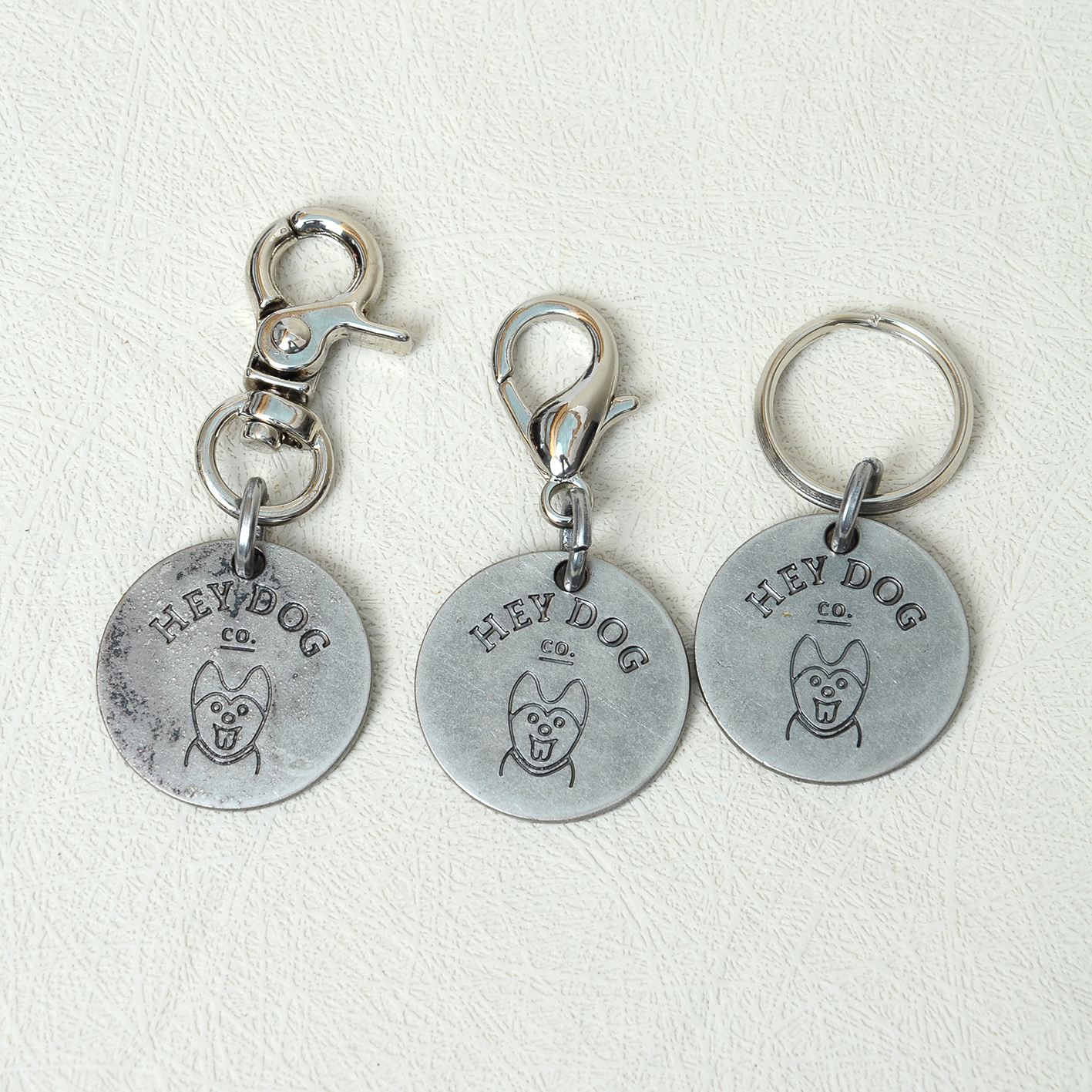 You can order a tag with the dog’s name and phone number (two phone numbers can fit easily). Our logo is on one side, and on the other, we put your data. You can add an area code if you are traveling with a dog. Old silver color coating. It is made of zinc alloy. We have three options for fastening: a ring, a tiny snap hook, and a snap hook.