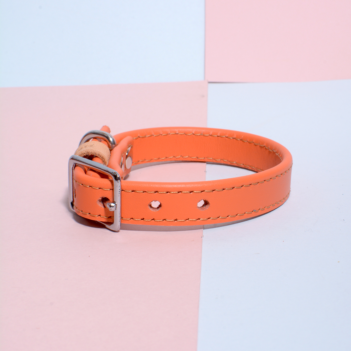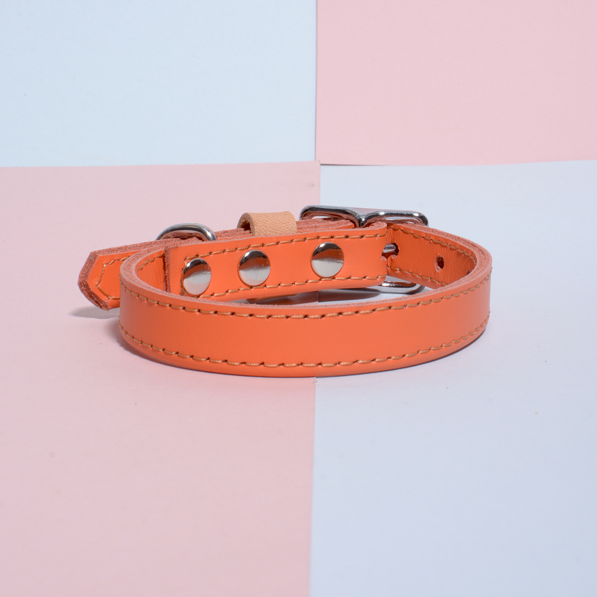 “Energetic Orange” elegant and stylish dog collar. Handcrafted collar made of grain, soft, cowhide leather. Three layers of leather. Color: orange. High-quality solid brass (gold) or nickel-plated steel (silver) hardware. It is polished to a high gloss. Next to the size, choose the color of the fittings. Inside the collar is a stiffening layer. Check out our SIZES and choose the right one for your dog. Want to buy a different size or width? Please write us at hey@heydog.co. We make collars for individual orders.