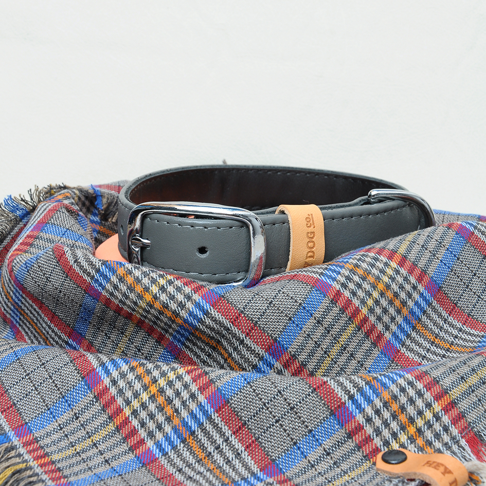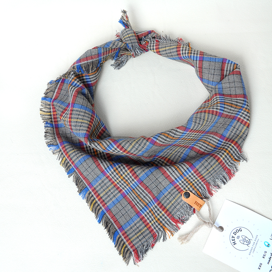 Grey & Blue Vintage bandana. Dog Bandana is made of soft bio cotton. Classic retro style. Colors: grey, red, orange, green, and black. Hand-made decorative edge.