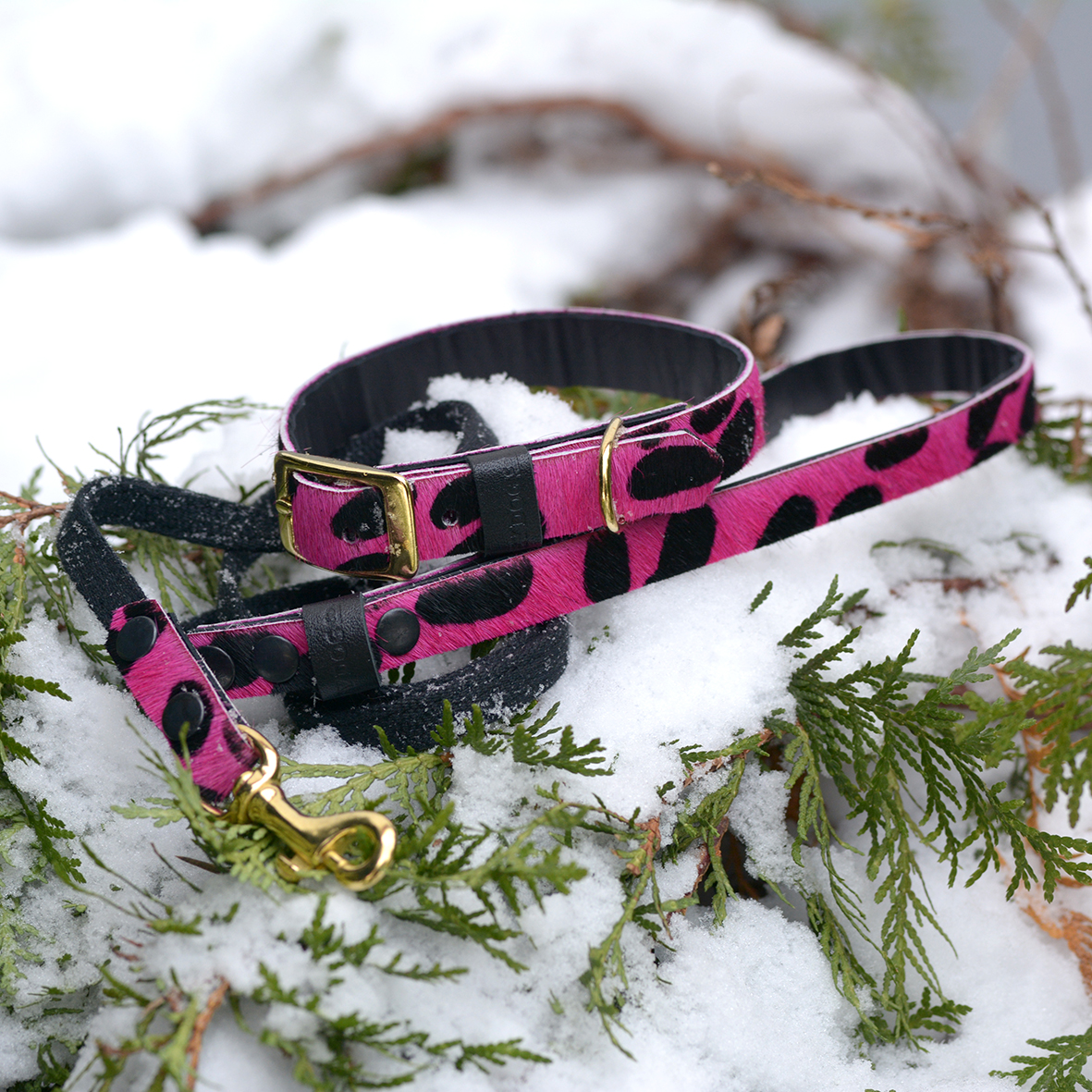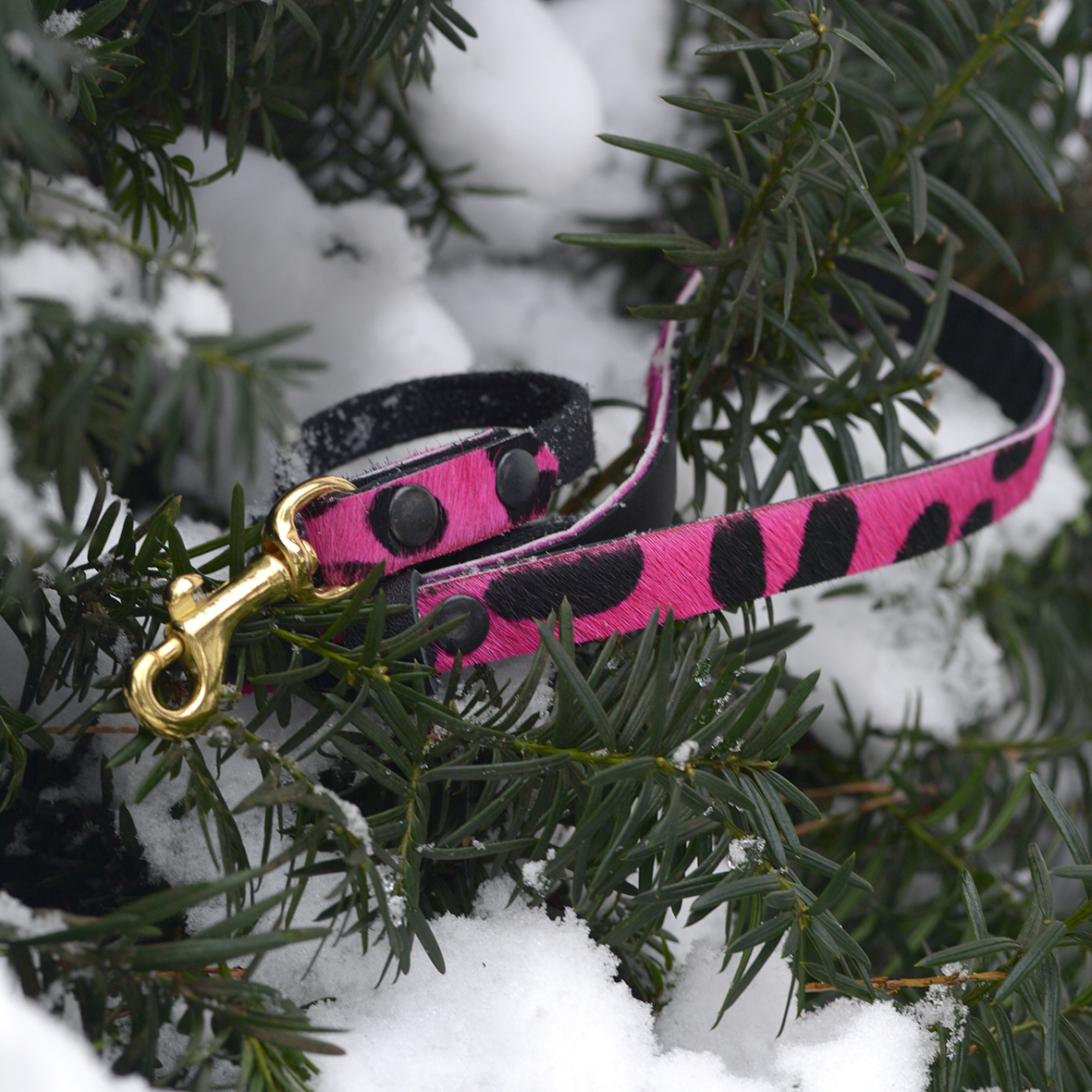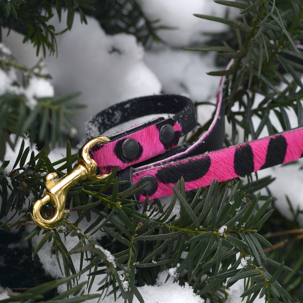 Amazing Pink Panther pattern! Cowhide with hair. Elegant and stylish city leash. Made of genuine leather combined with strong tape. Our leashes are light and comfortable to use. Leather color: pink and black. Tape color: black. Hardware is made of solid brass polished to a high gloss. We suggest setting up this leash with a HEY DOG Hot Pink Panther collar, making your dog stylish and exceptional.