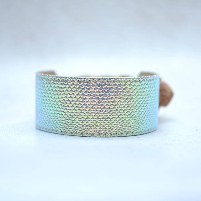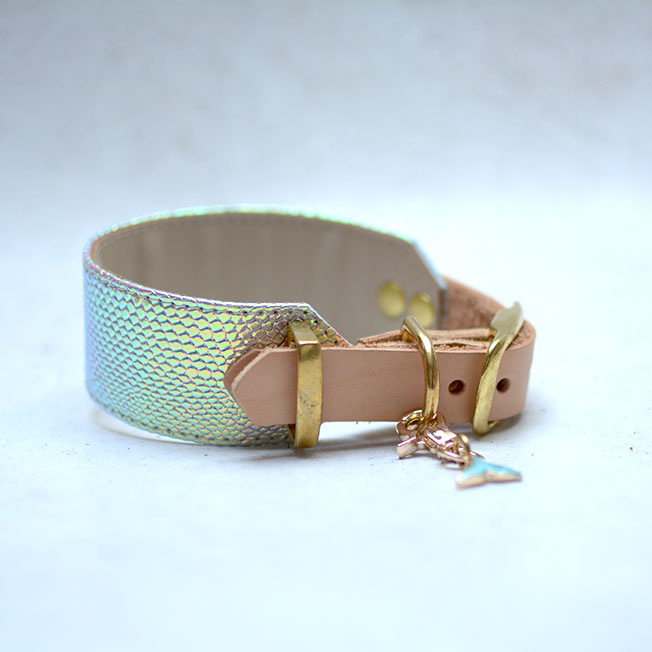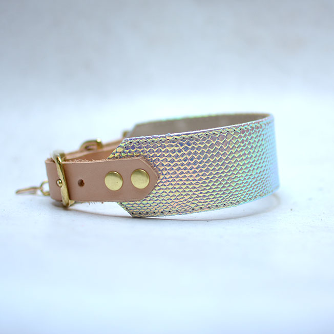 Wide collar for Greyhounds and dogs that should wear such collars for comfort. Leather covered with holographic foil. Shimmers with different colors depending on the light. Colors: blue, turquoise, pink.