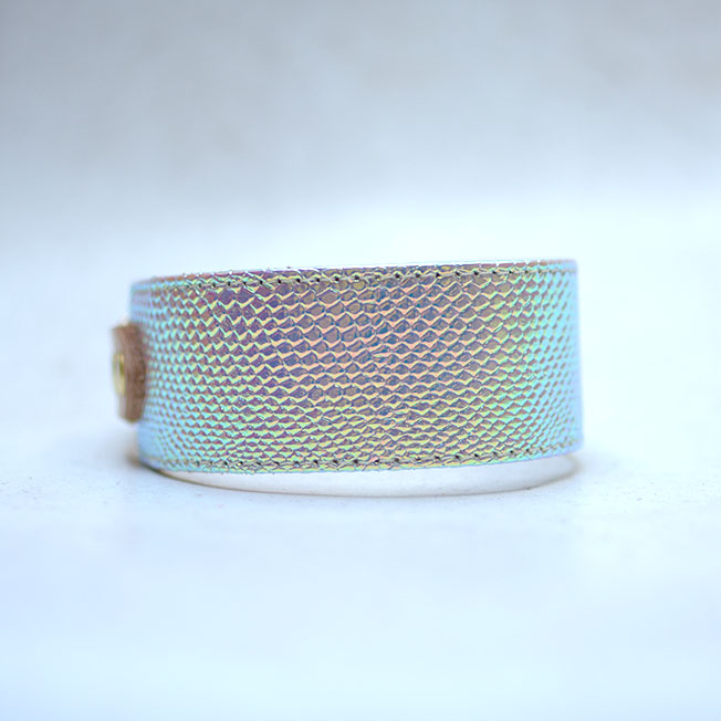 Szeroka, skórzana obroża dla charta. Unikatowa skóra pokryta hologramową folią, która mieni się różnymi kolorami.