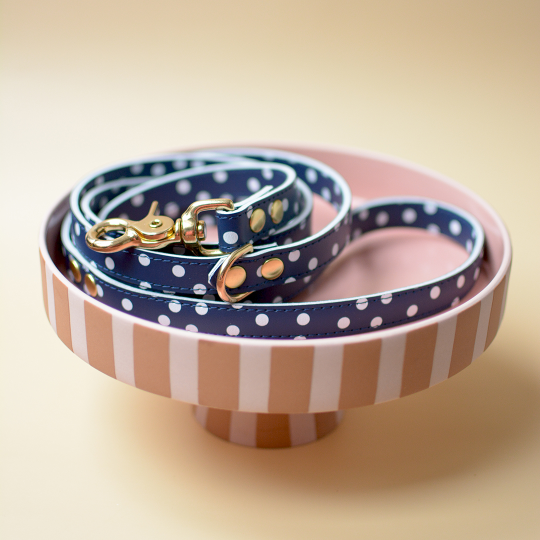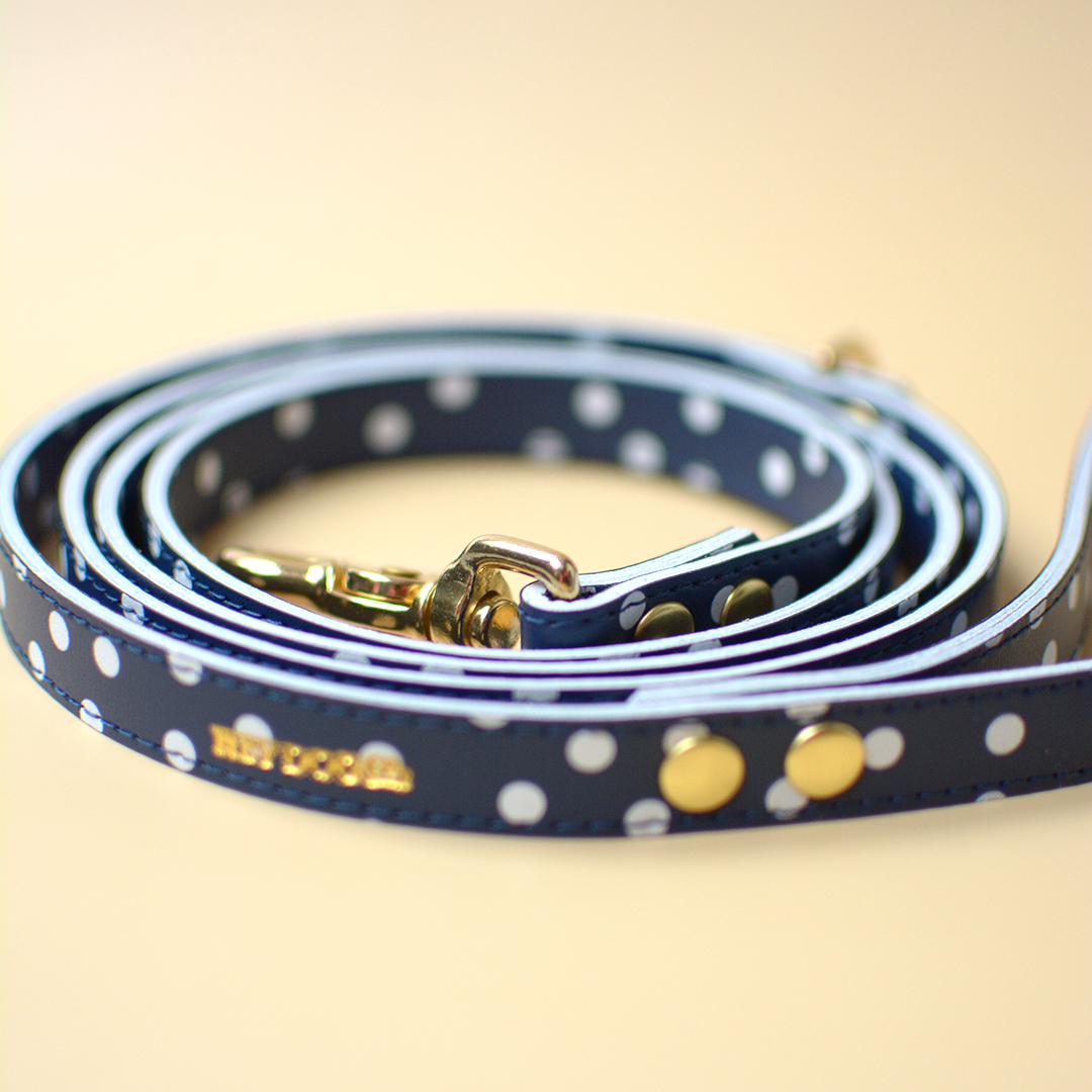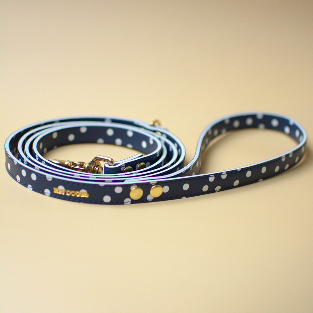 An elegant leather leash for everyday city walks! It goes perfectly with the ‘Navy Blue polka-dot’ collar. The accessories will create a charming set for your pet.