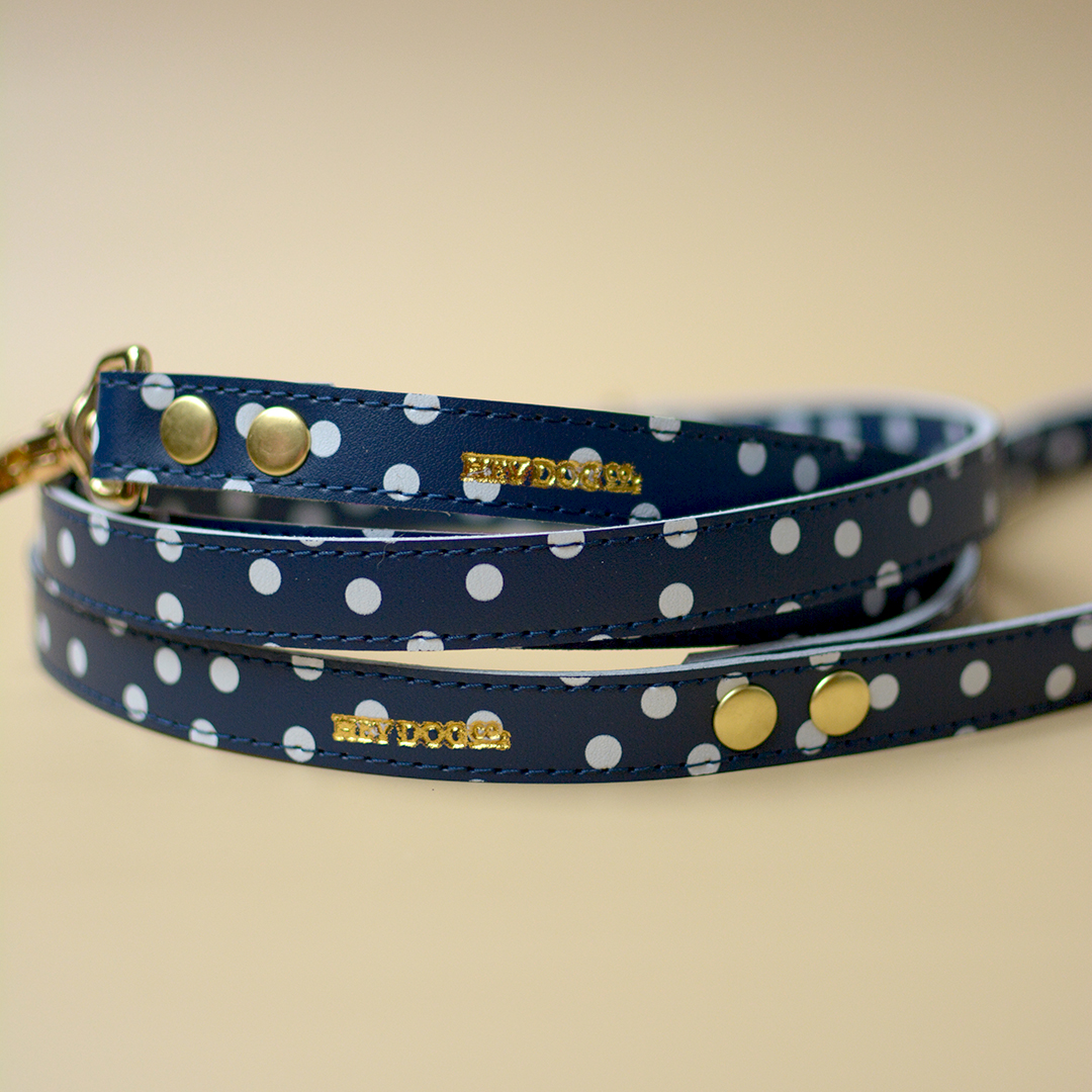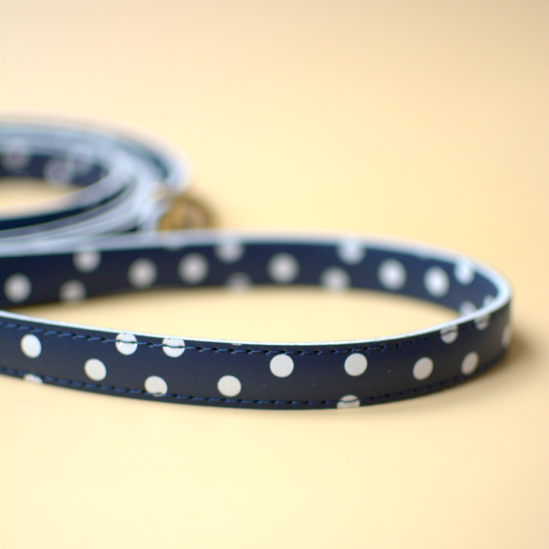 Elegant, urban leash in a polka dot print! Navy blue color. A stylish leash for you and your dog!