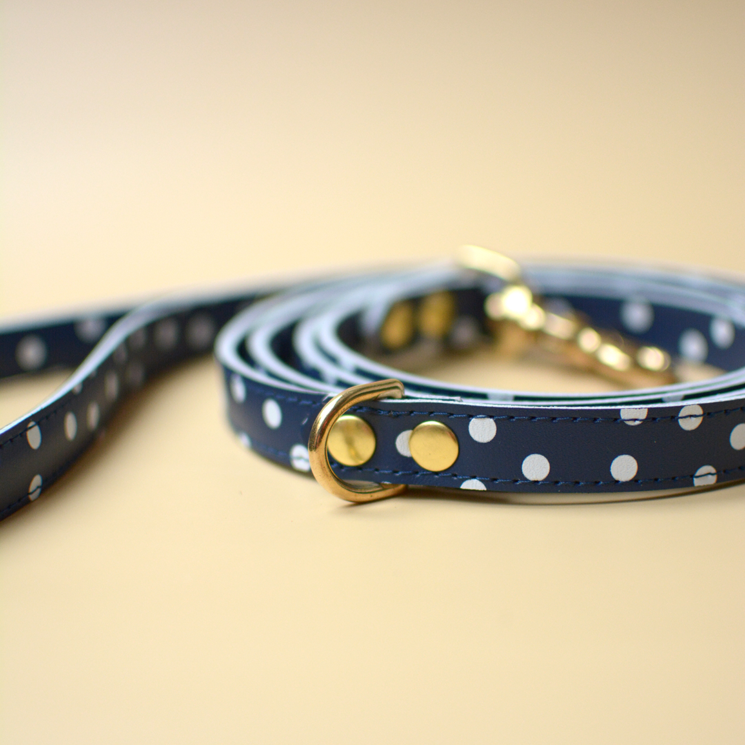 The leash is made of leather with a fashionable polka-dot pattern. The handle is soft and pleasant to the touch. Color: navy blue and white dots.