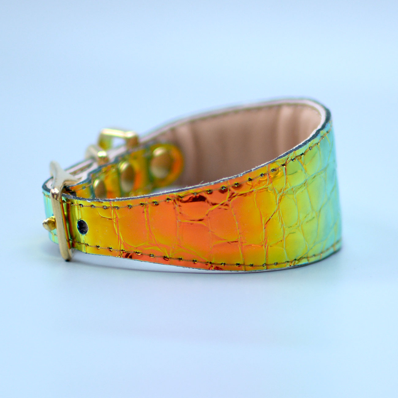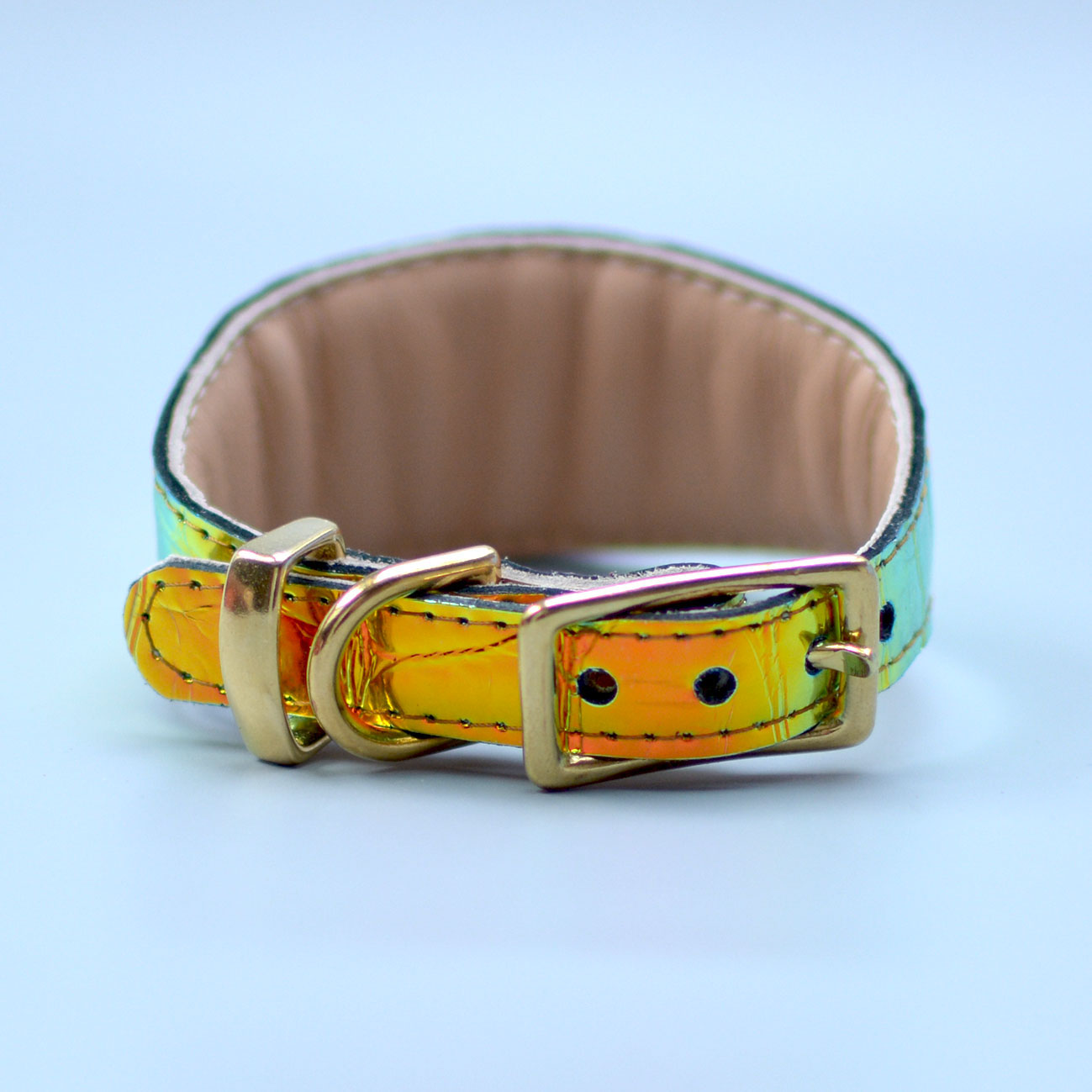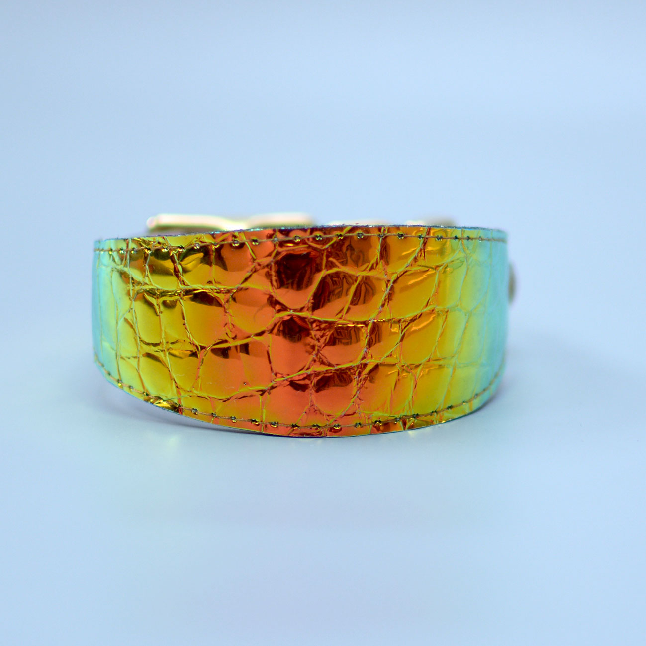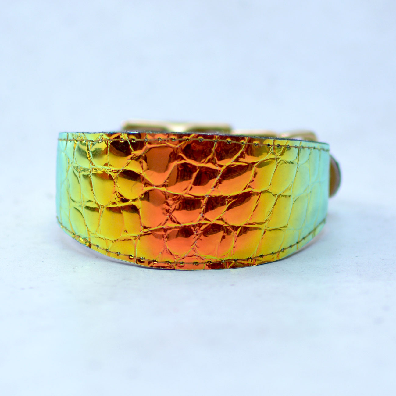 Wide collar for Greyhounds and dogs that should wear such collars for comfort. Leather covered with holographic foil. Shimmers with different colors depending on the light. Colors: gold, orange, green.