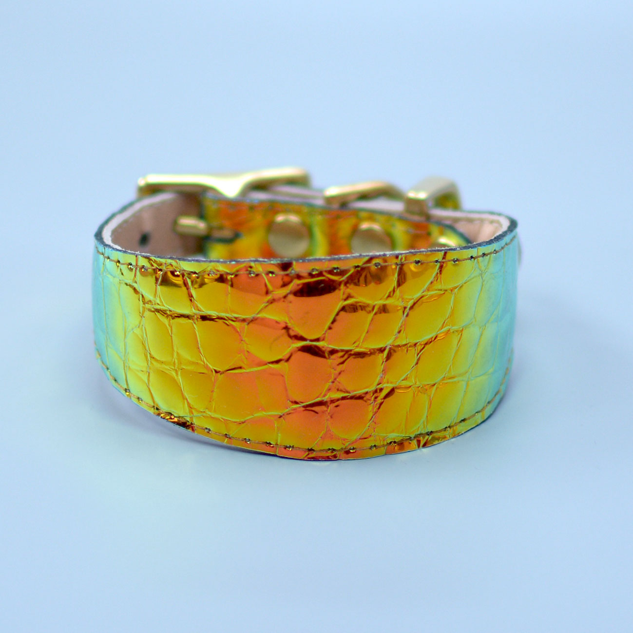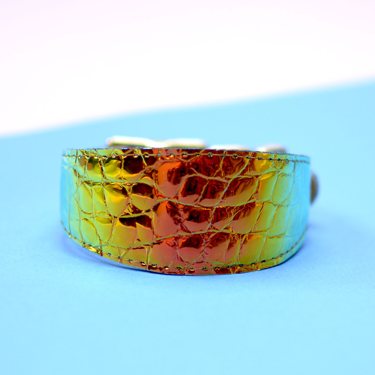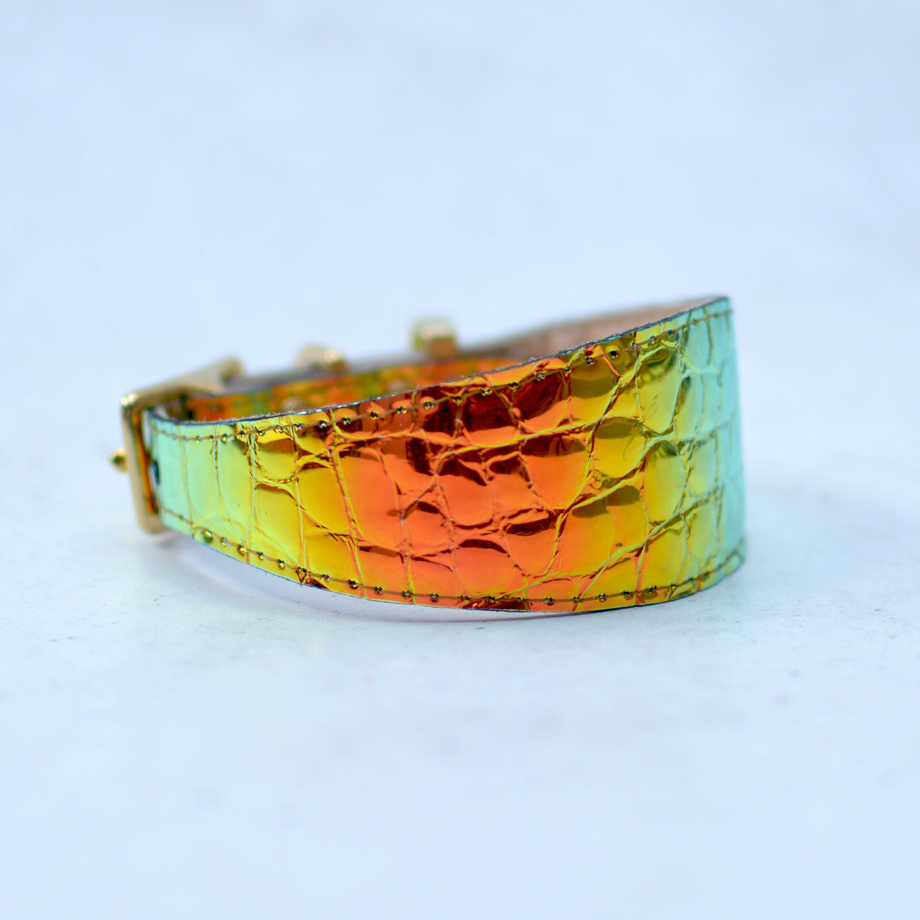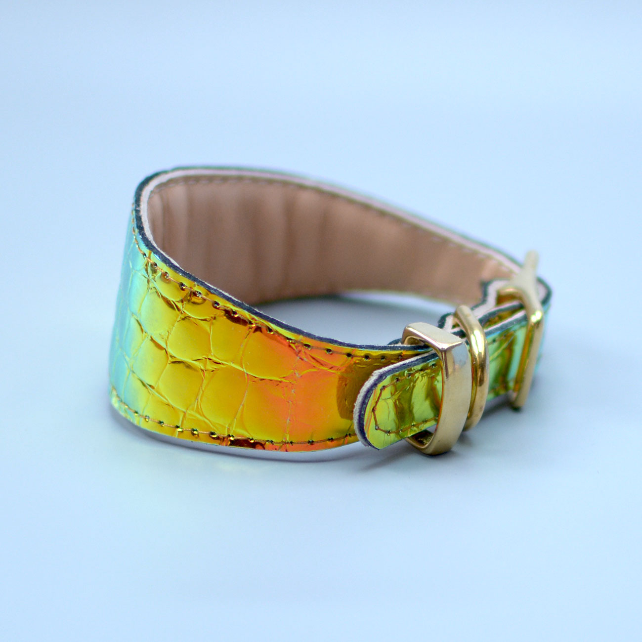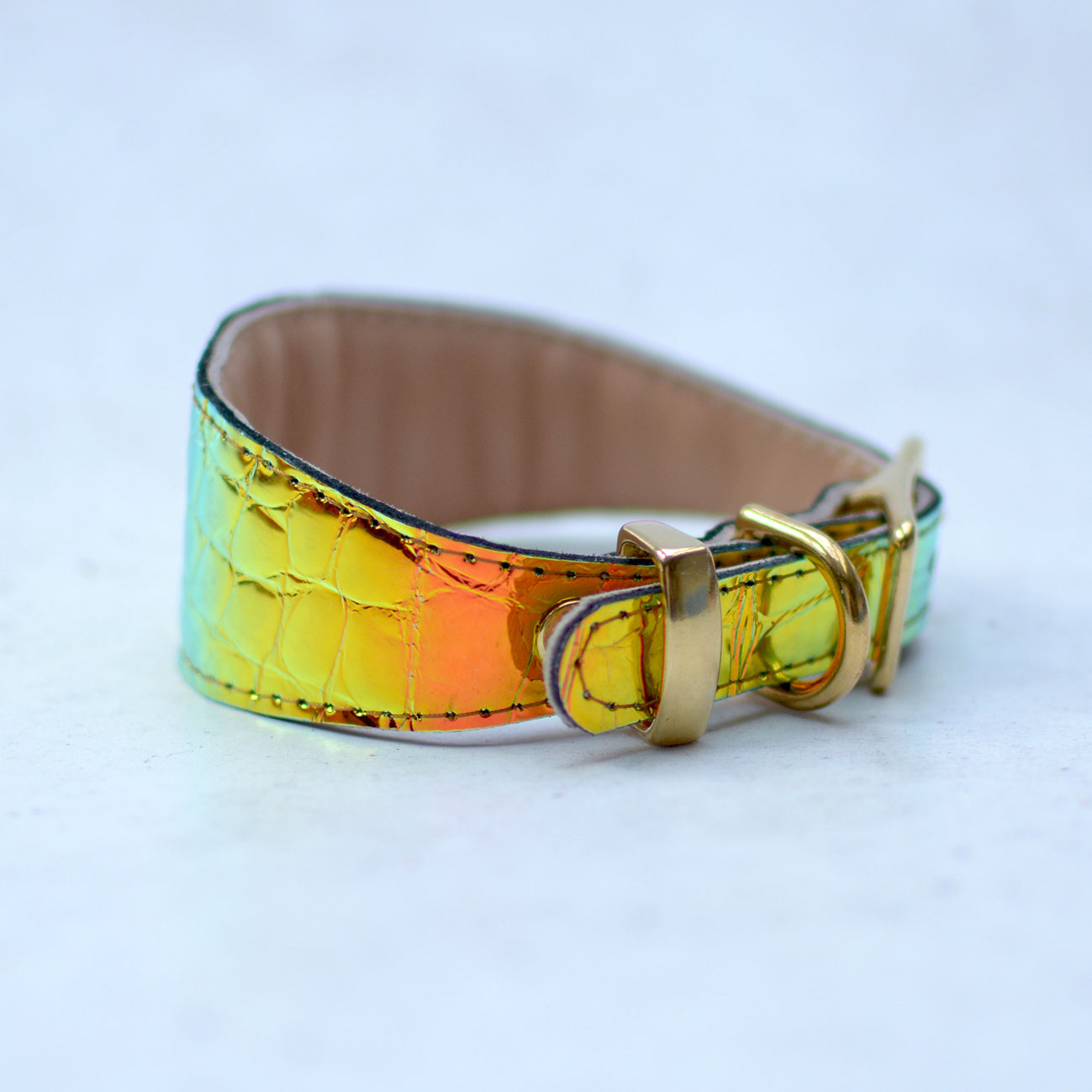 Wide collar for Greyhounds and dogs that should wear such collars for comfort. Leather covered with holographic foil. Shimmers with different colors depending on the light. Colors: gold, orange, green.