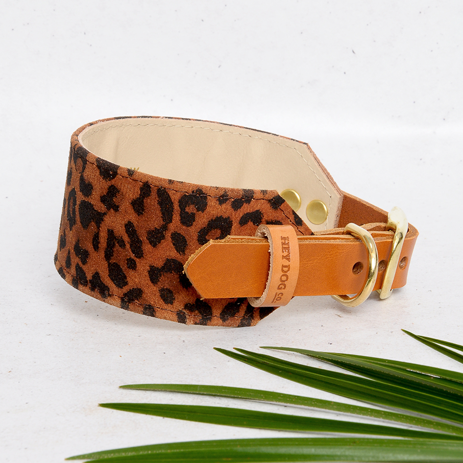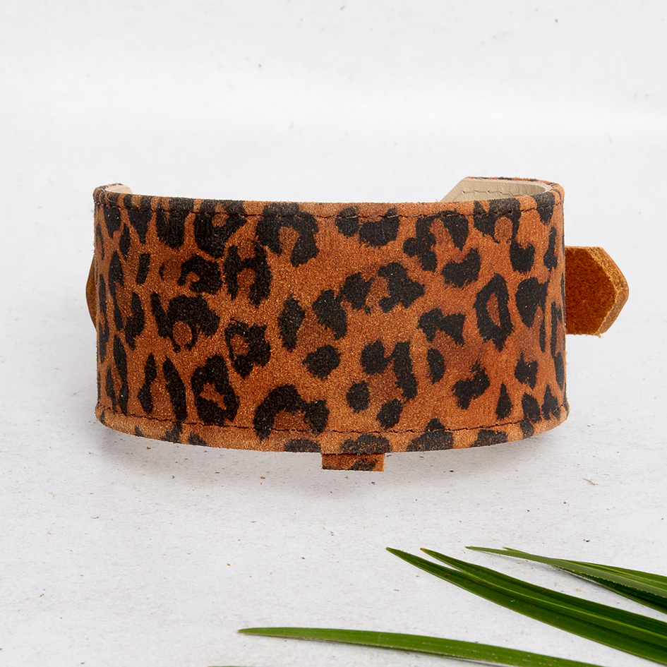 Obroża dedykowana chartom i psom, które dla wygody potrzebują nosić szerokie obroże. Obroża wykonana jest ręcznie z miękkiej, naturalnej skóry. Klasyczny wzór panterki.