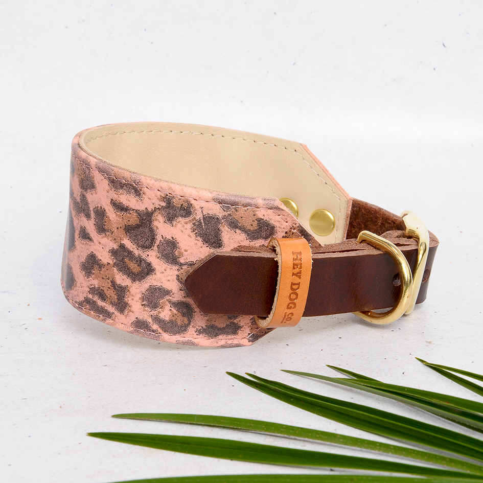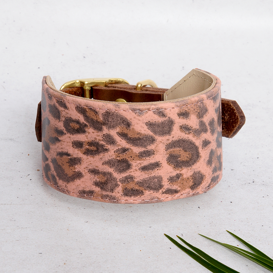 The special collar is dedicated to greyhounds and dogs, which need to wear wide collars for comfort. Handcrafted collar made of soft suede leather. The collar is nice to the touch. Beautiful leopard pattern. Colors: salmon pink and brown. Buckle straps are made of chocolate brown RAW leather. Thanks to this, the clasp is strong and does not stretch. We use the highest quality fittings! These are brass castings, strong, durable, and polished to a high gloss. They do not wear off, they remain golden.